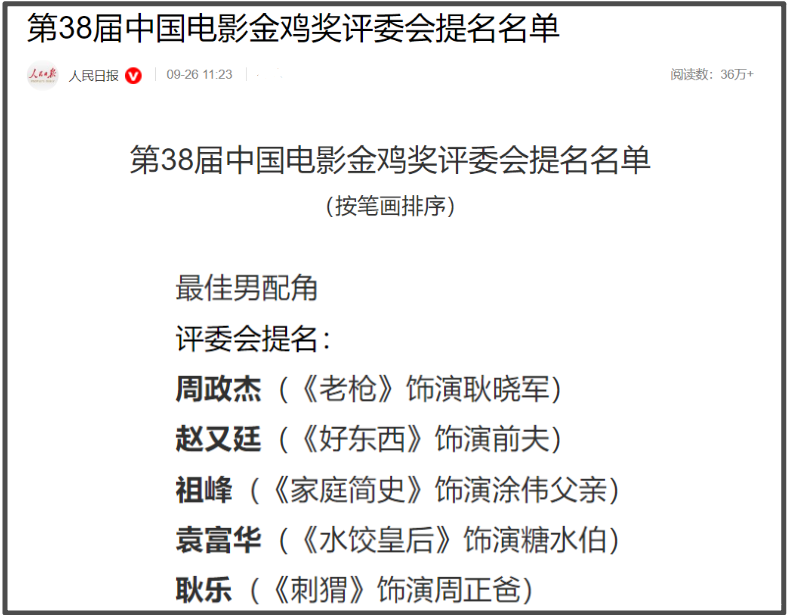 获得最佳男配角提名的有周政杰、赵又廷、祖峰、袁富华、耿乐。