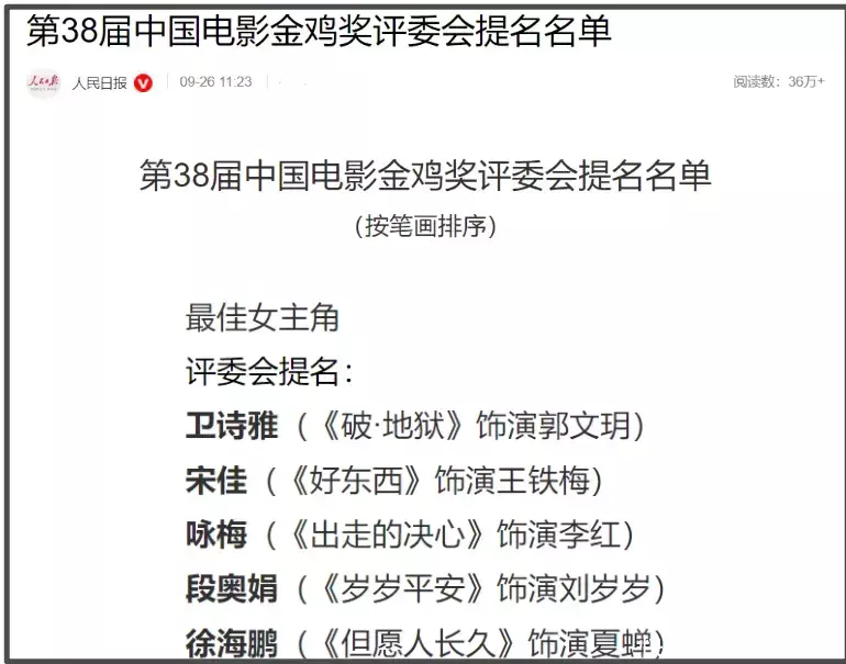 获得最佳女主角提名的有卫诗雅、宋佳、咏梅、段奥娟、徐海鹏。